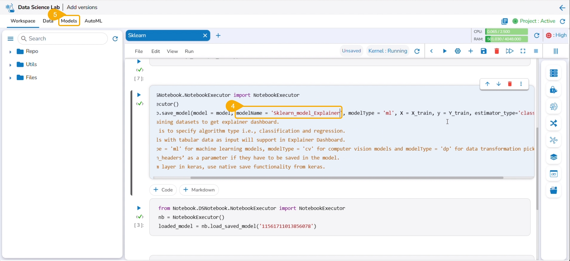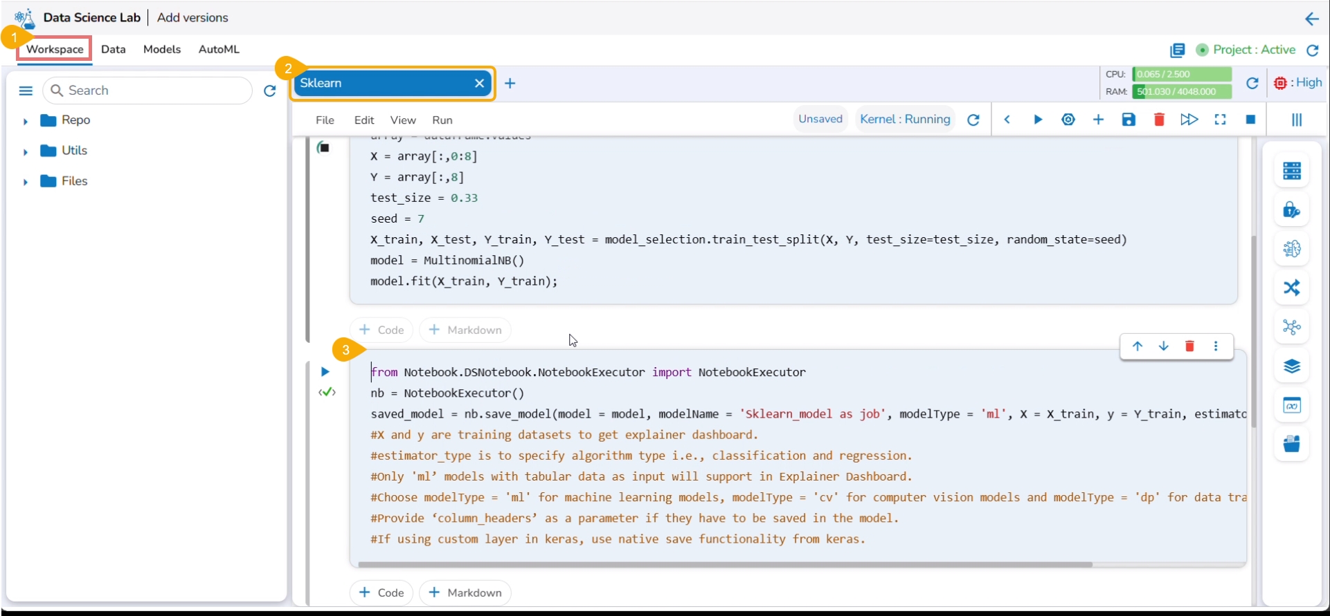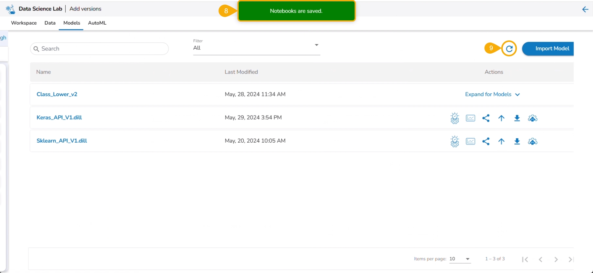 A notification message ensures that the concerned Notebook is saved. The user gets redirected to the Models tab.