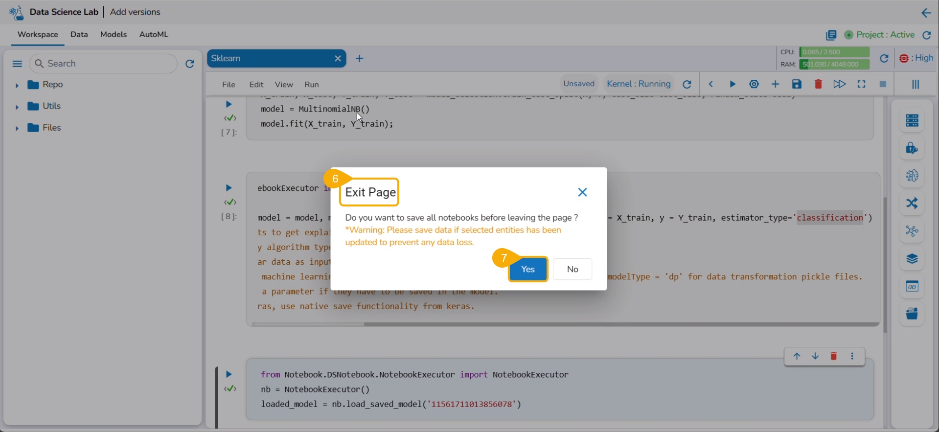 The Exit Page dialog box opens to save the notebook before redirecting the user to the Models tab.