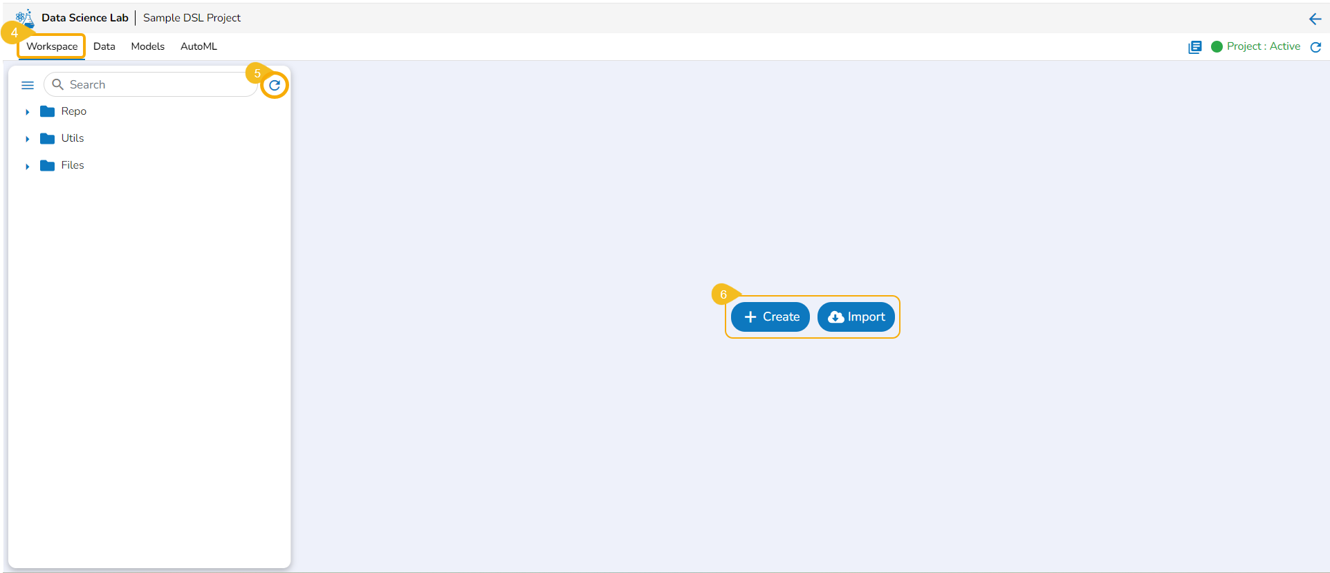 Please Note: If the selected project is a Repo Sync Project, it will only contain a Repo folder under the Workspace tab. Here, the Repo folder will support all file types. Three folders (Repo, Utils, and Files) will be available under the Workspace tab for a normal Data Science Lab project.