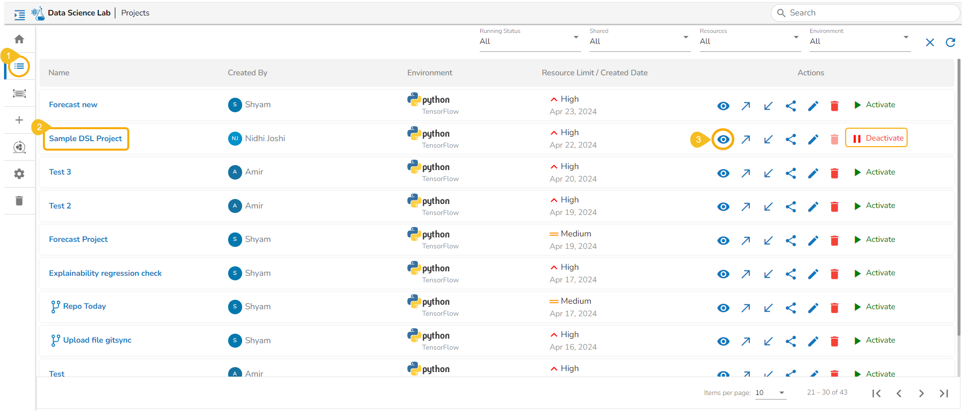 The Workspace is the default tab to open for each Data Science Lab project. Based on the Project types the options to begin working with Workspace may differ.