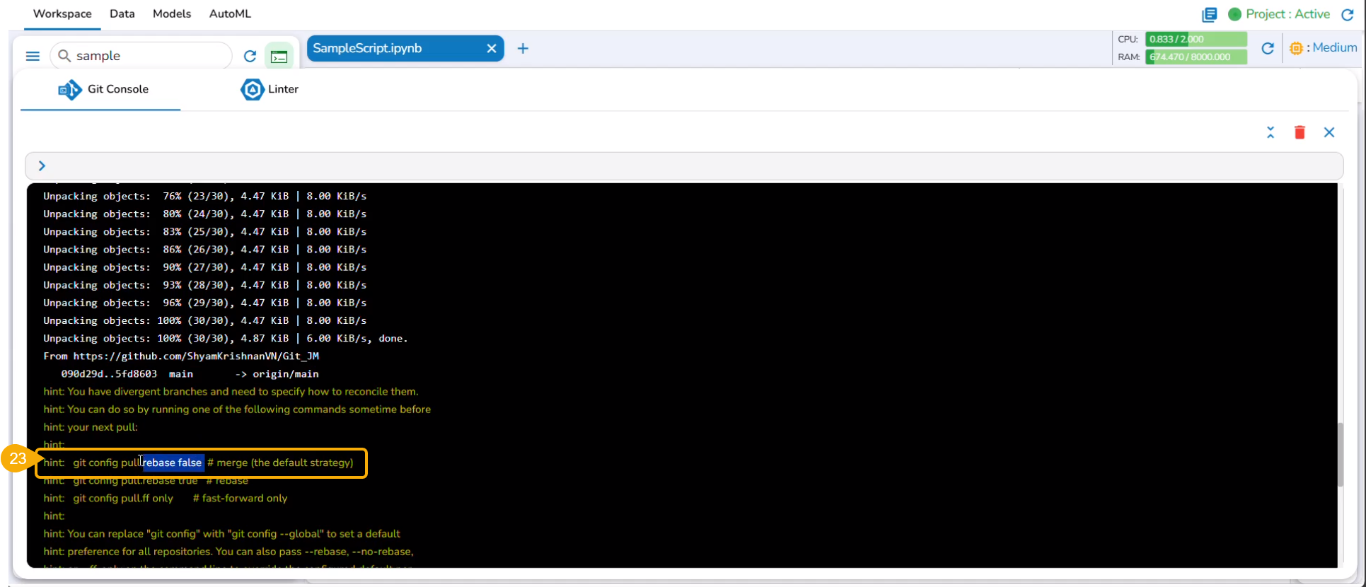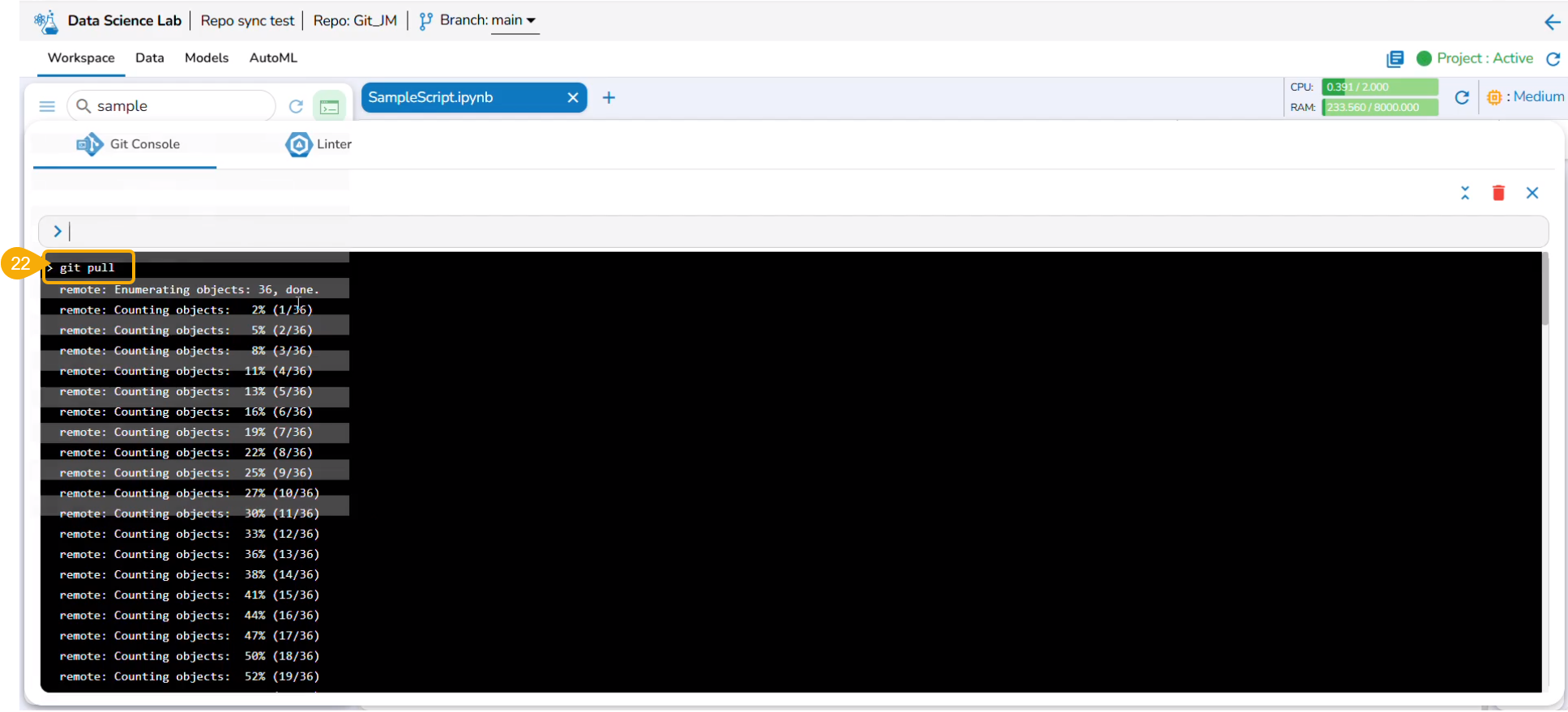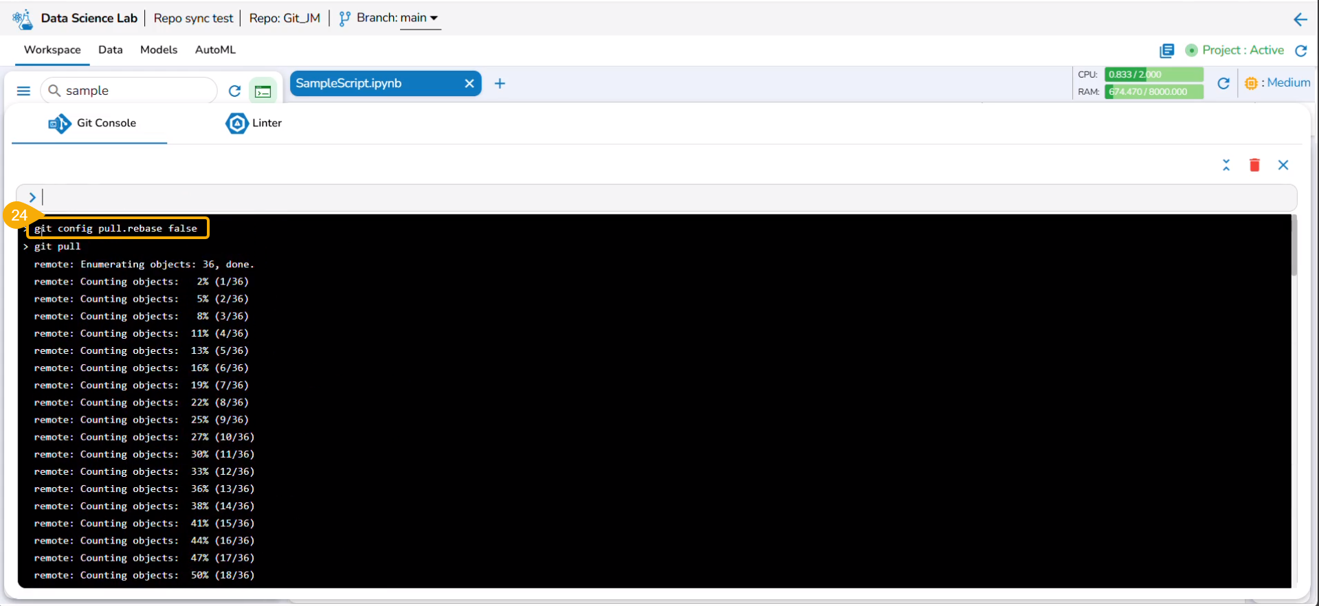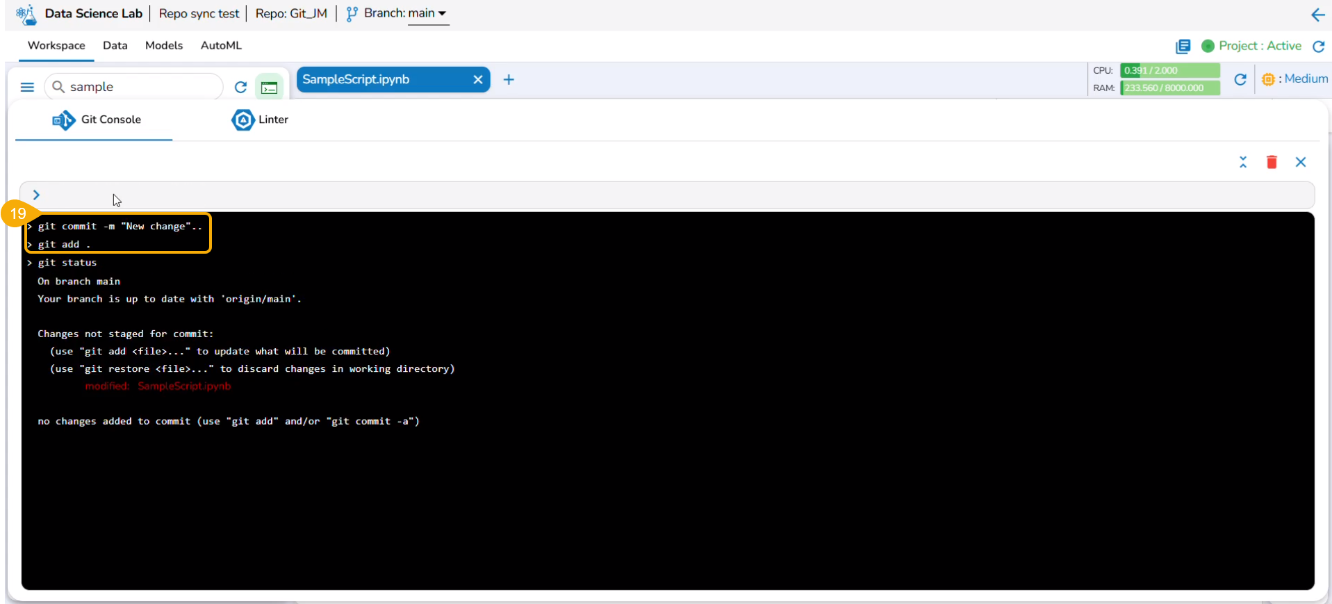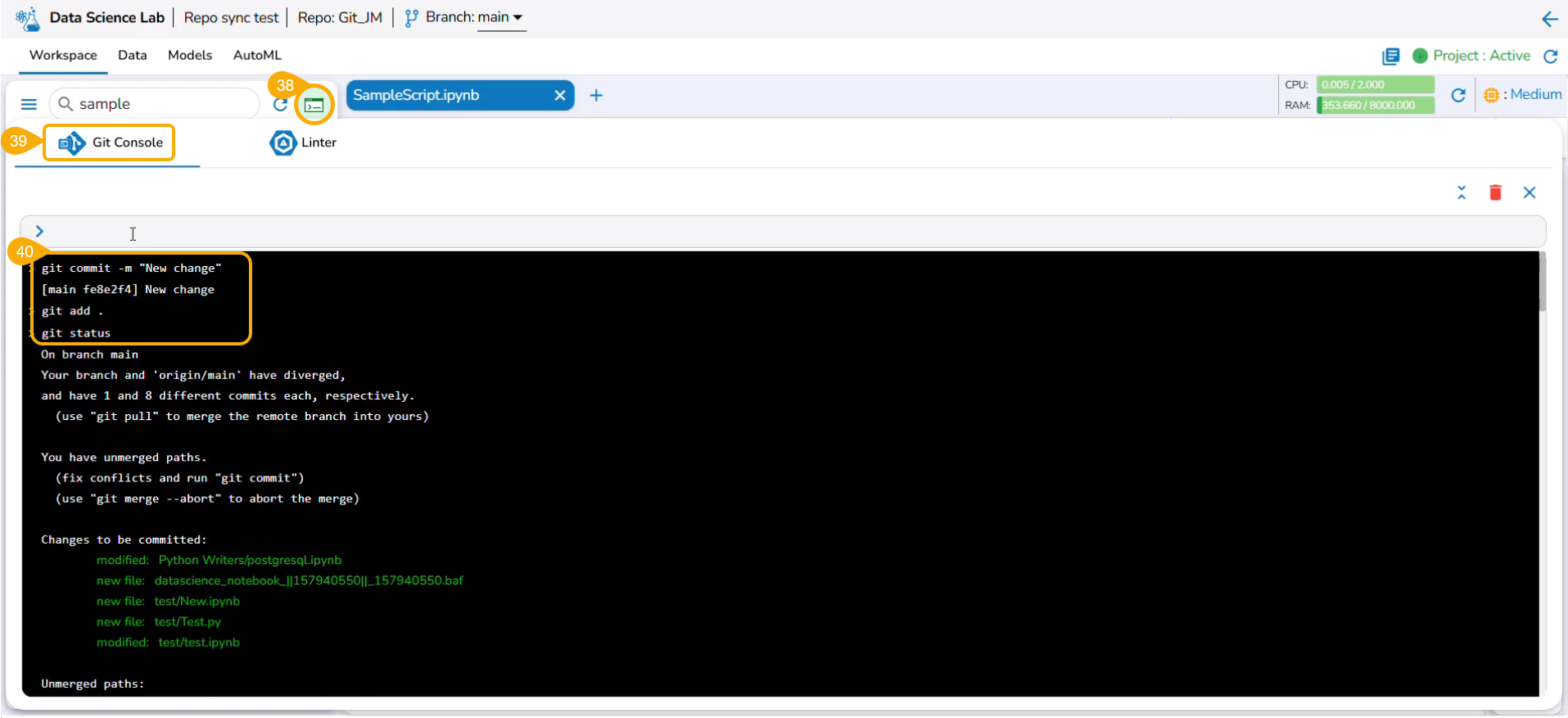 Git Console functionality helps the data scientists apply various Git commands to their Notebook scripts inside the Repo Sync projects.