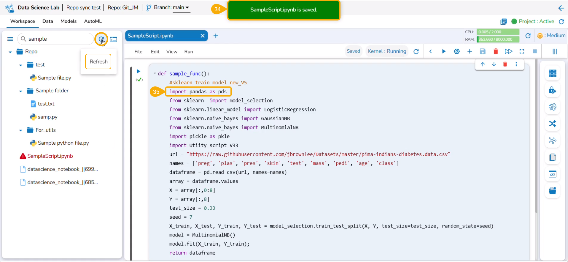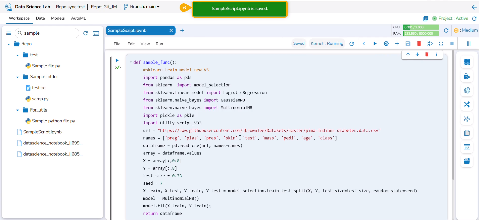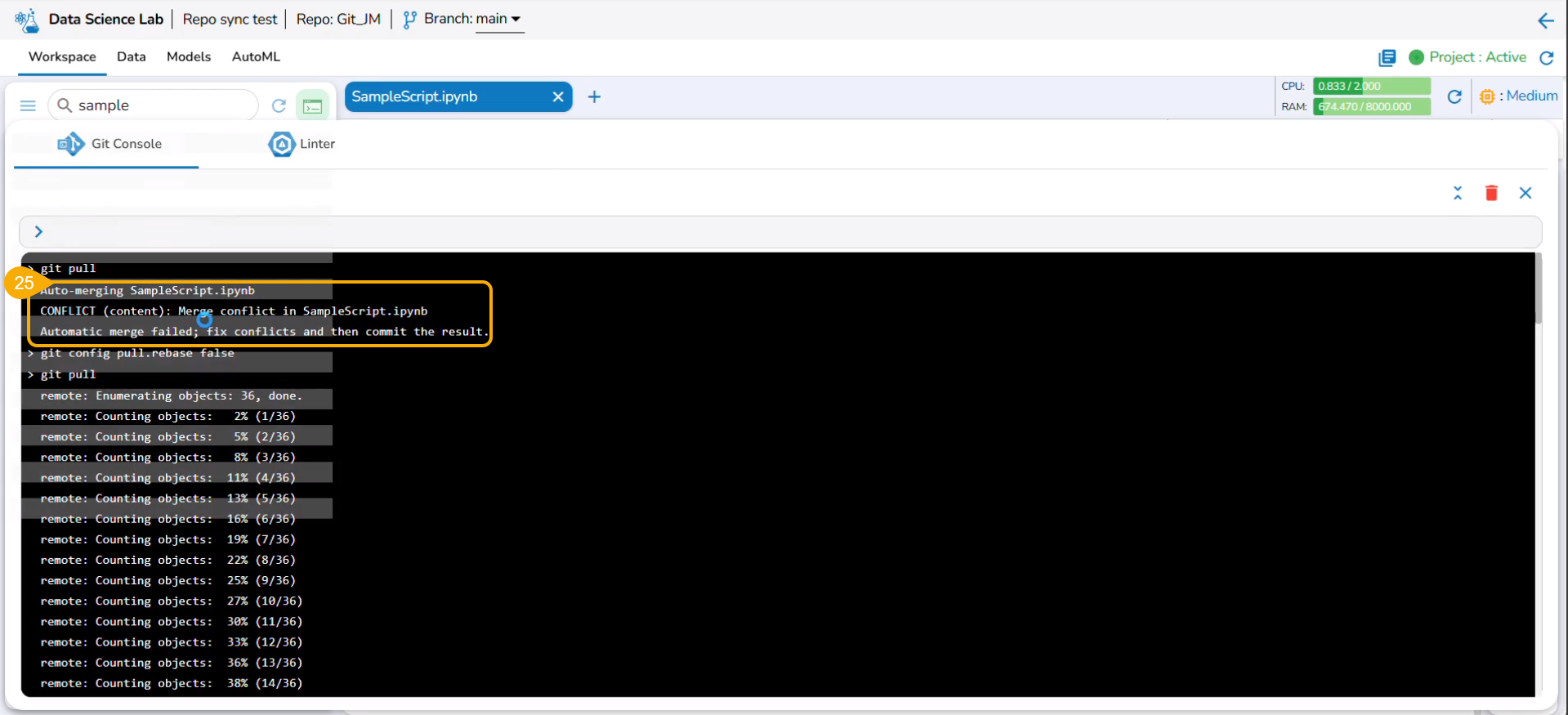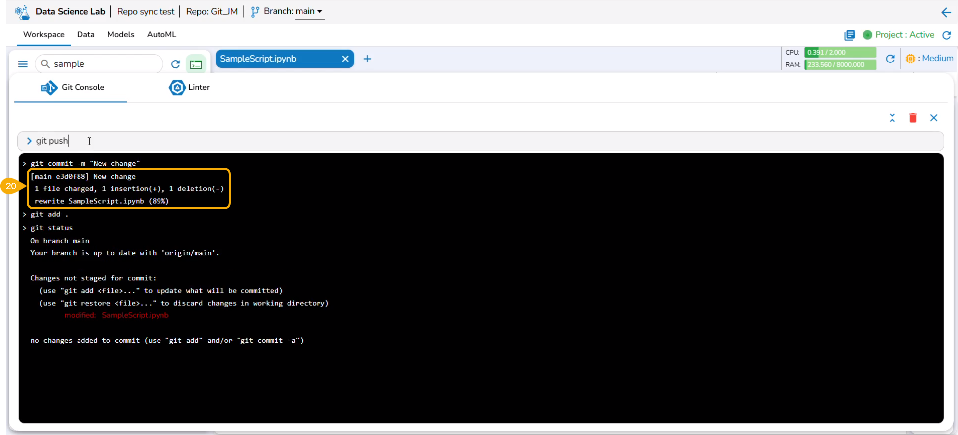 Git Console functionality helps the data scientists apply various Git commands to their Notebook scripts inside the Repo Sync projects.