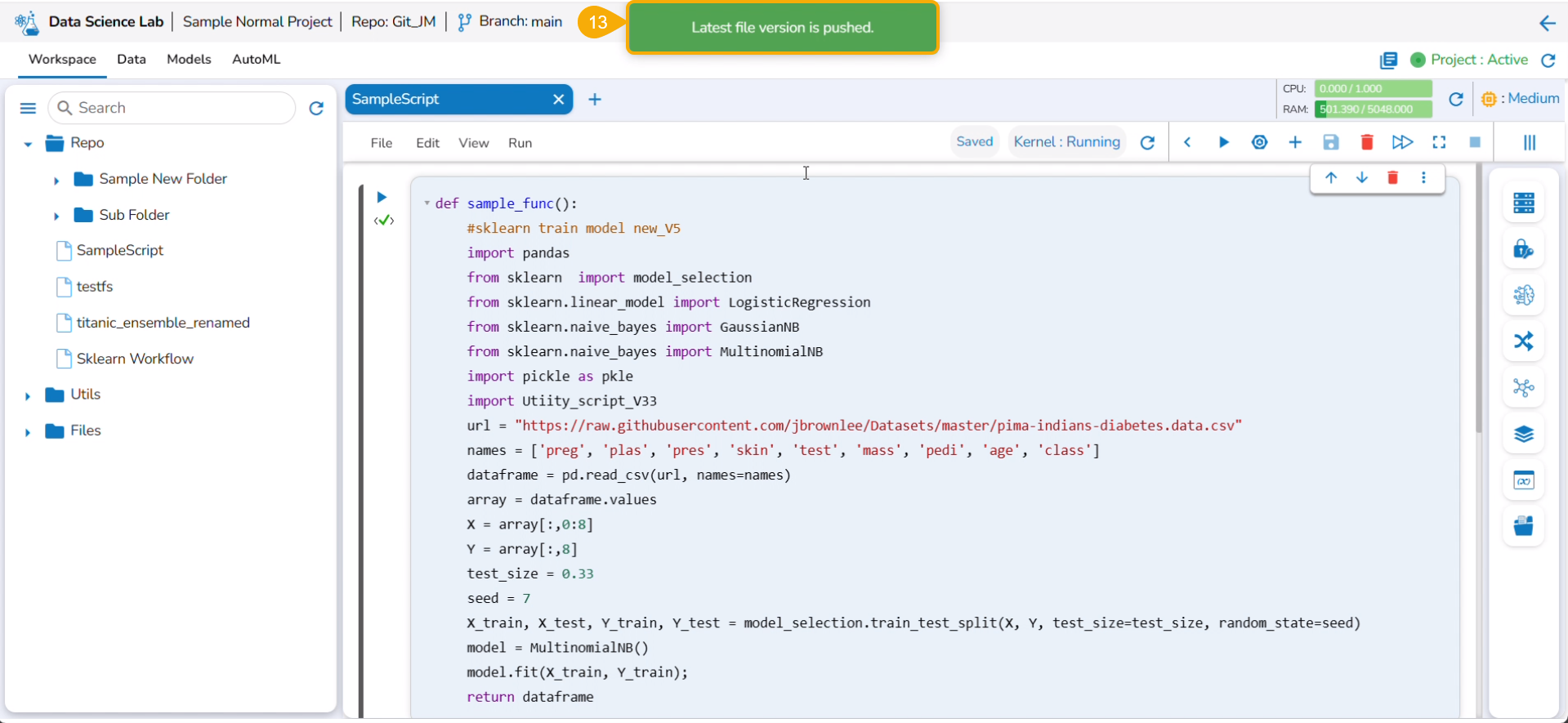 The latest file is pulled into DS Lab before modifying and pushing back to the Git branch.