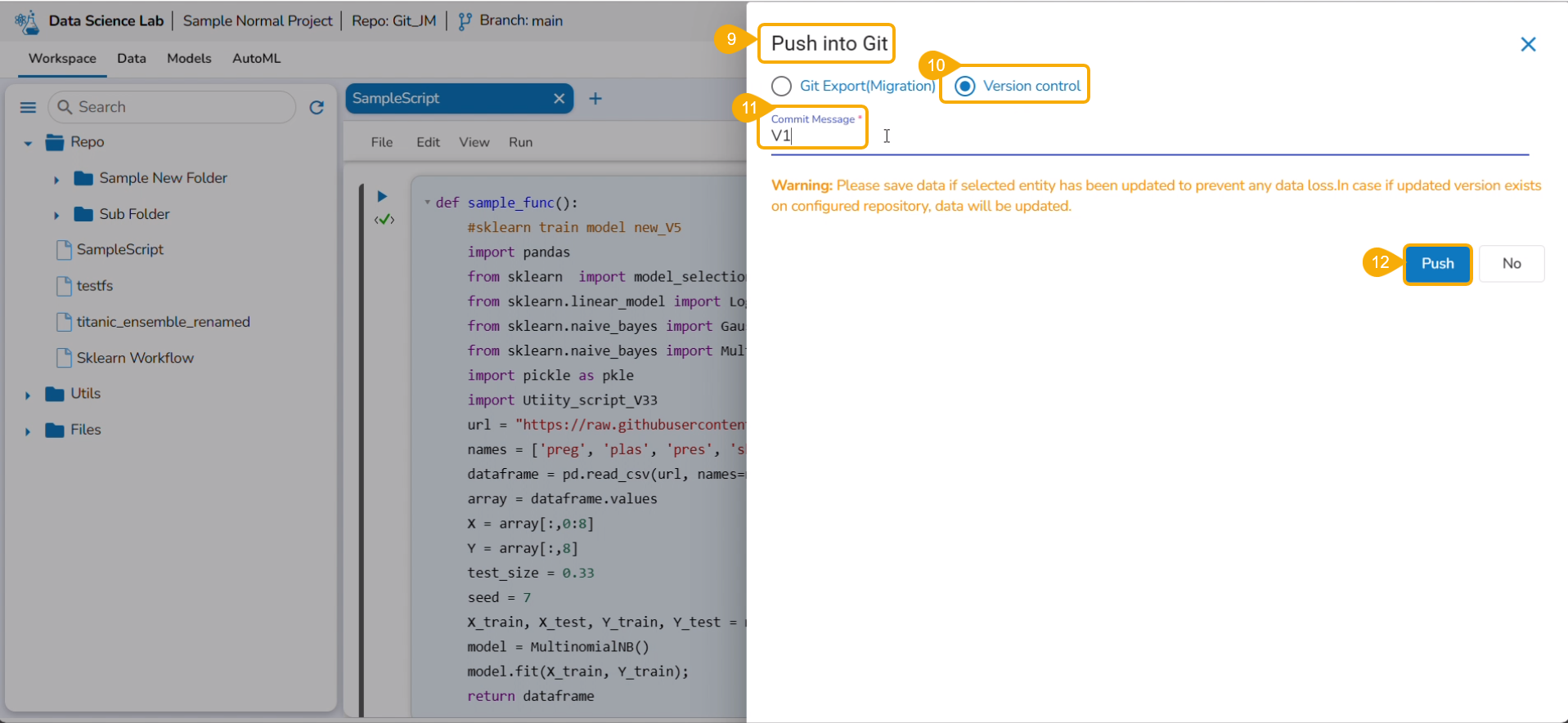The user needs to Pull a version of the file from Git before using the Pull and Push functionality for the projects where the source files are available in Git Repo.