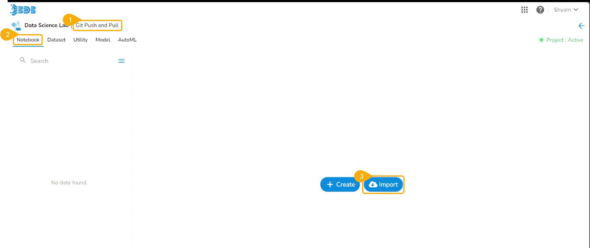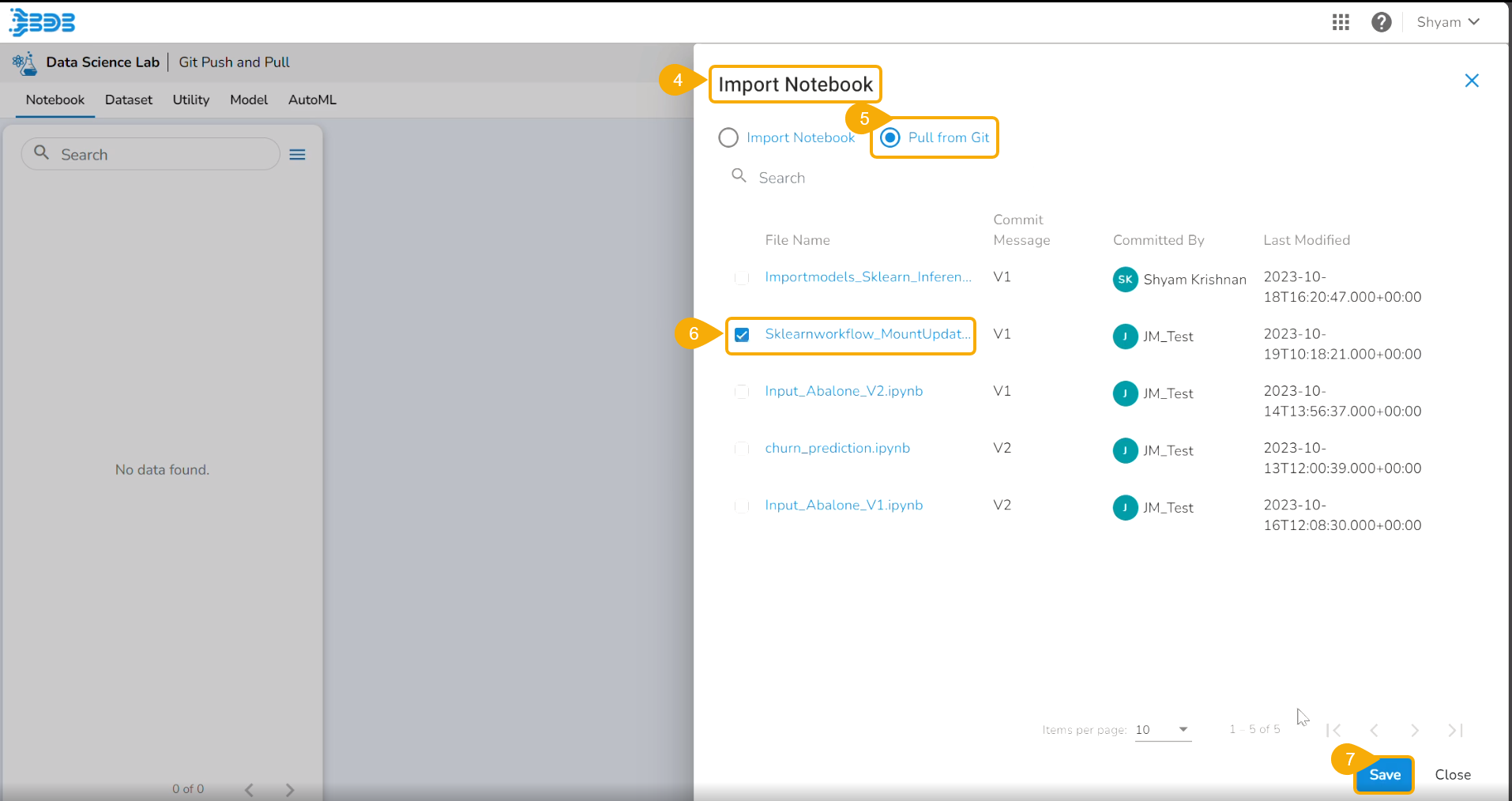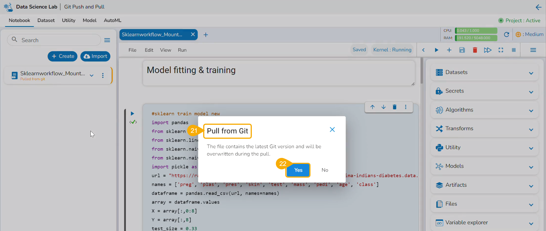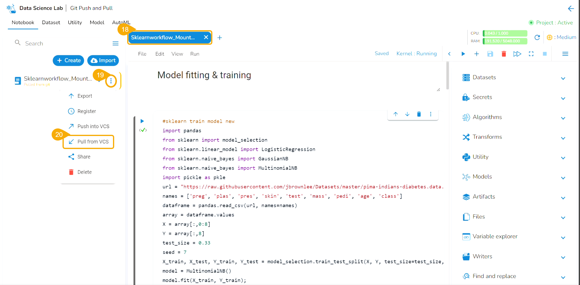 Projects and Branches created in GitLab/GitHub can be accessed using the access token inside the DS Lab and the files (.ipynb) can be pulled using the Pull from Git functionality.