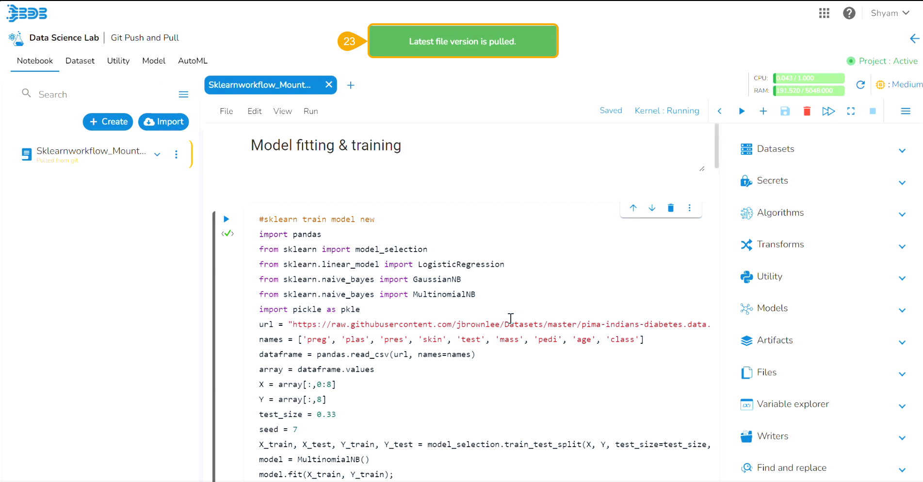 Once the initial pull (import) has happened, the user can pull the latest version of the Python file from Git using the Pull from VCS functionality available in the Notebook List.