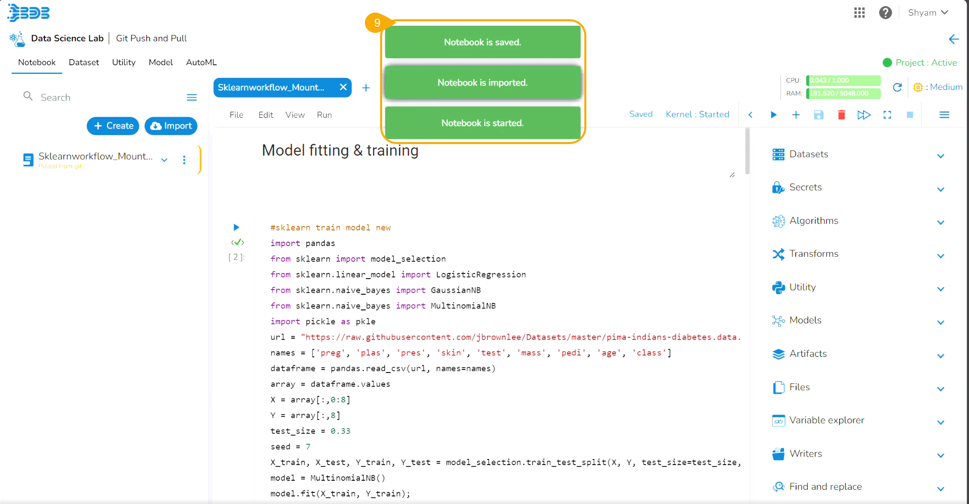 Consecutive notifications ensure that the Notebook is started, imported, and saved.
