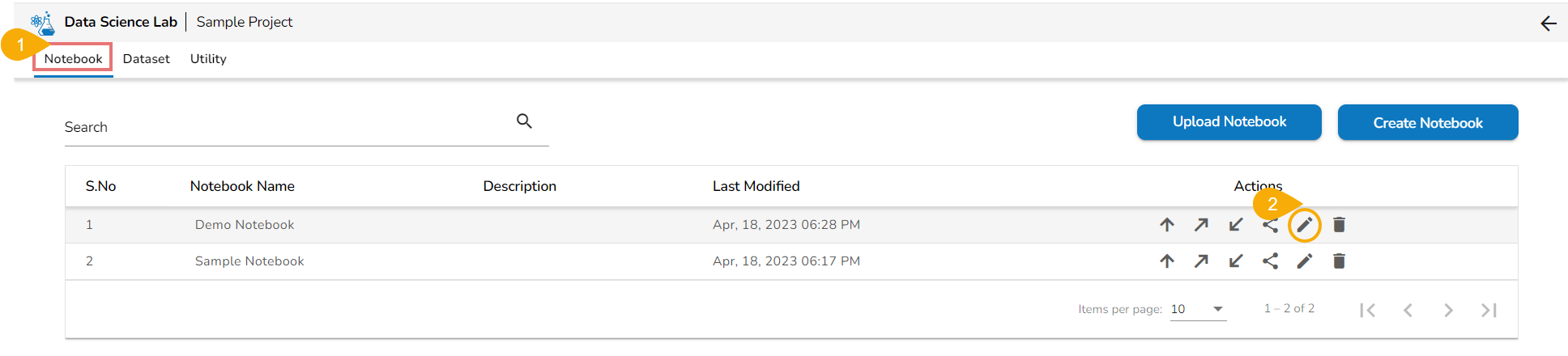 <figure><img src="https://1025450693-files.gitbook.io/~/files/v0/b/gitbook-x-prod.appspot.com/o/spaces%2Figrg2b2URgwMO5YmejDu%2Fuploads%2FMOJK68yCxZp4Lthm0ZKQ%2Fimage.png?alt=media&#x26;token=1fa2258e-6d26-478e-84d2-a534de3fca20" alt=""><figcaption><p><em><strong>Accessing the Edit icon for a Notebook</strong></em></p></figcaption></figure>