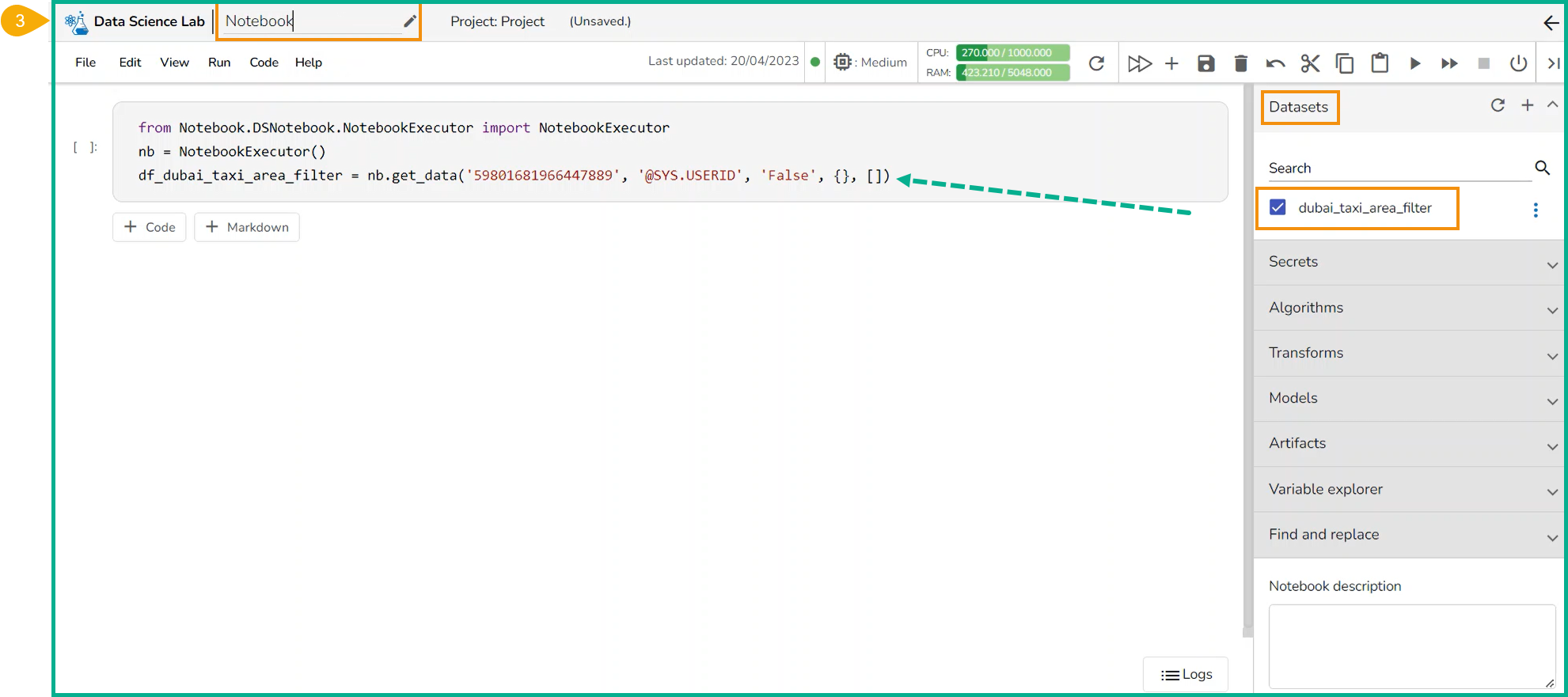 The **Notebook** tab lets the user write and execute code. The user can harness the full power of popular python libraries to analyze and visualize data.