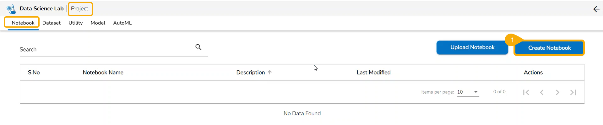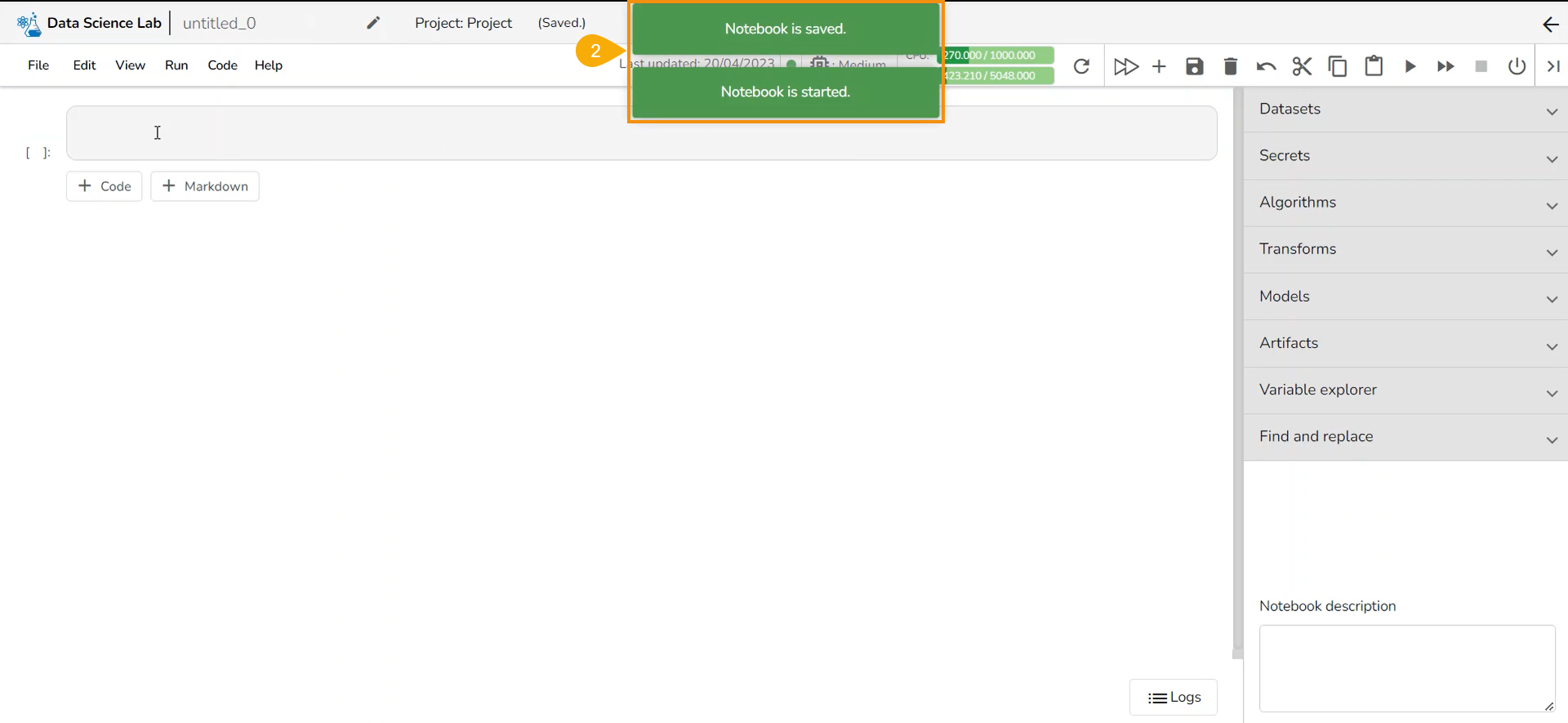 1. By [**Creating a new Notebook** ](https://docs.bdb.ai/7.6/data-science-lab/project/various-tabs-to-work-with/notebook/ways-to-access-notebook/creating-a-notebook)**​**