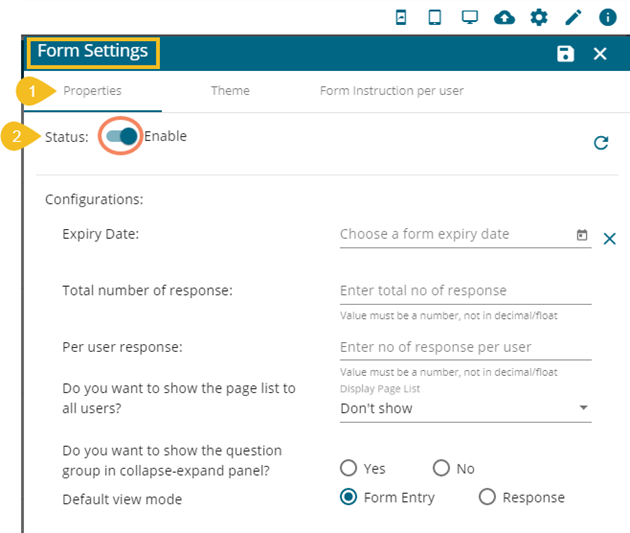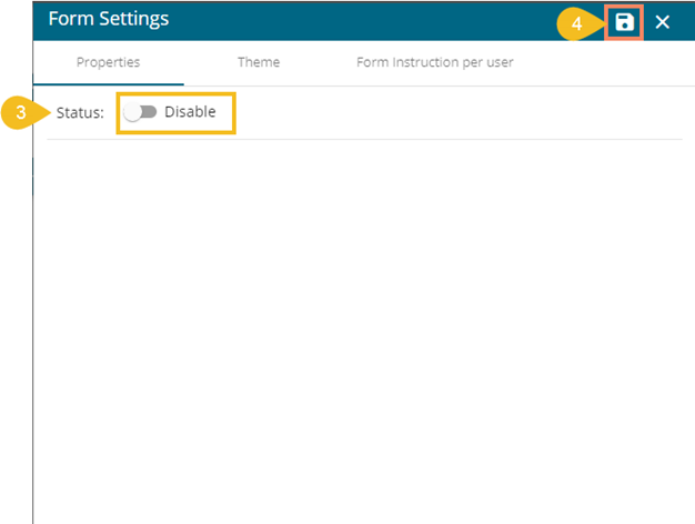 The display of the Properties field is determined by the Status option.The ***Properties*** tab provided under the ***Form Settings*** displays a radio button to enable or disable the status of the Form content.