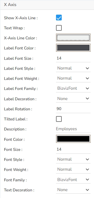 The user can change the axis name, Font color, Font size, enable the axis line and changed the axis color.