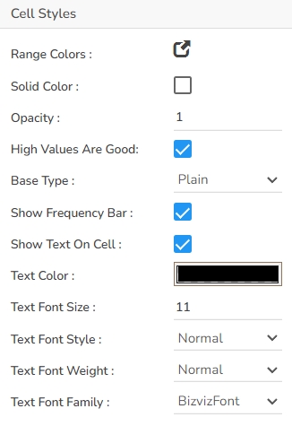 The user can change the cell color, give the range color, show the frequency bar, change font size, style, etc. using the Cell Styles properties.