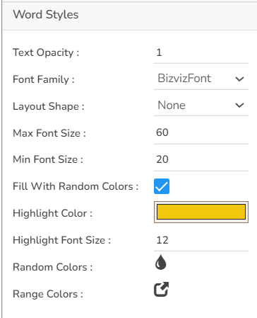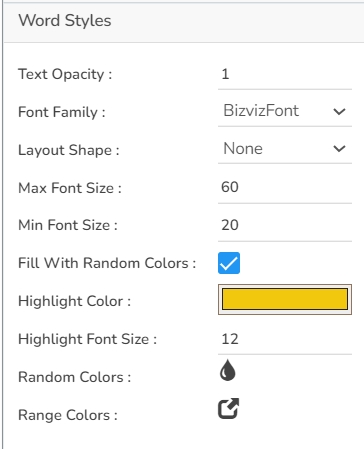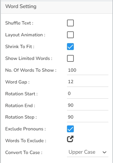This Properties help the users to configure various settings such as Shuffle Text, Layout Animation, Shrink To Fit, Show Limited Words. The users can also decide on the number of words to show, the gap to be maintained between two words, Rotation properties. It is possible to exclude the synonyms of the words that have multiple synonyms. The text case can also be selected using the Convert To Case option.