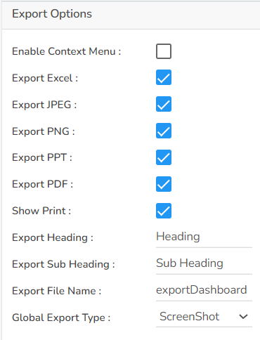 The user can enable the Enable Context Menu to download the reports in different formats if we click on the chart from the preview section. The heading and sub heading of that downloaded chart and the name of the downloaded file can be change from this section.