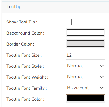 The user can choose to display Tooltip for the Sankey chart using these properties fields. This option also helps the users to set background color, border color, and various properties for the Tooltip fonts.