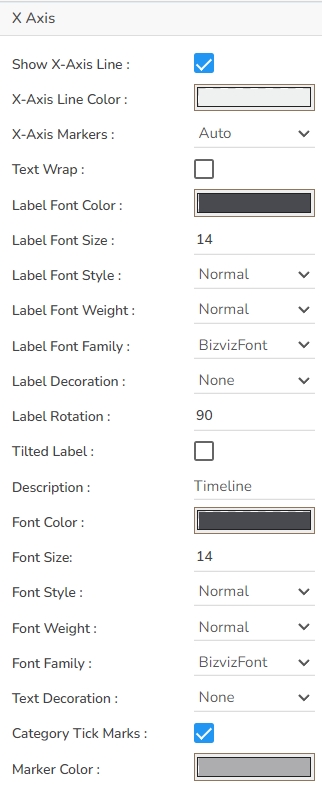 The user can change the axis name, Font color, Font size, Enable the axis line, and the axis color.