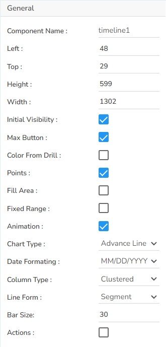 The user can change the height, width, top, left, chart type, column type & Line form. In this case, we have changed the chart type to Advance Line, column type to Clustered & line form to Segment.