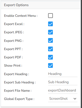 The Export Options also helps to provide heading, sub heading, file name. The user can also select an option for Global Export Type.