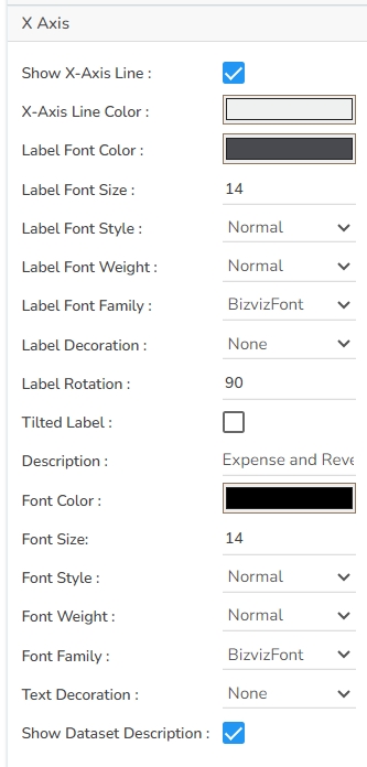 The user can change the axis name, Font color, Font size; enable the axis line, and change the axis color of the X Axis.