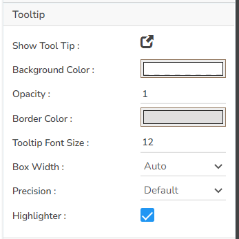 * The user can set and modify background color, opacity, border color, Tooltip font size properties using these properties fields.