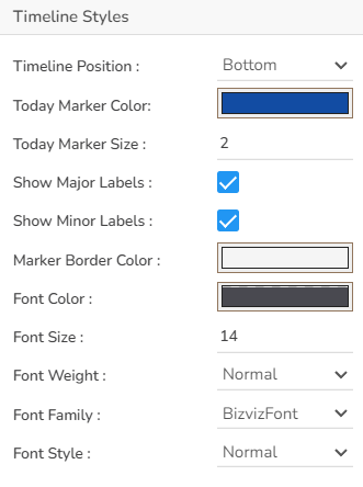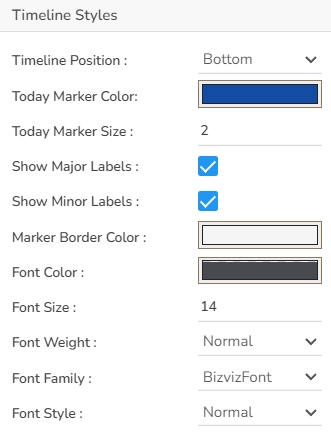 The user can change the Timeline position to bottom, left, right, can change the Today marker line color & marker size, can enable the minor & major labels, can change the font size, color, style, etc.