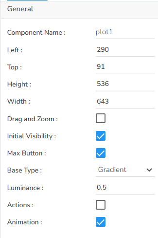 General: The user can change the height, width, top, left. If initial visibility is not enabled, then the chart won’t be available for the first preview. The base type can be adjusted between Gradient and Plain.