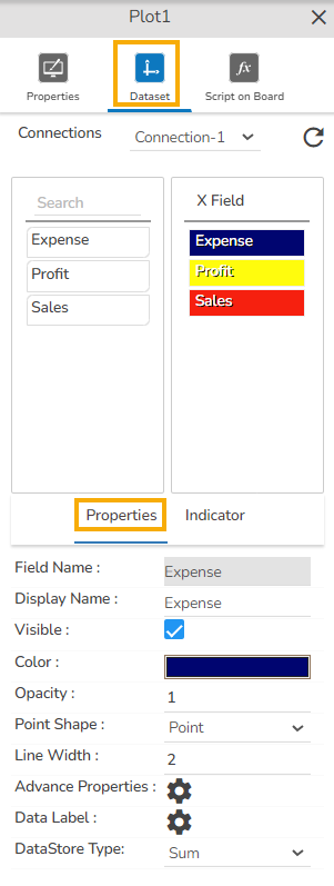 Map a dataset to the dragged Scatter plot component and you can drag the given columns under the X Field. After mapping the data, the user gets Properties and Indicators tab for the Dataset values to get displayed in more effective manner.