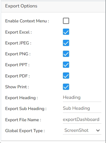 The user can enable the ‘Enable Context Menu’ to download the reports in various formats by clicking on the chart from the preview section. The user can change the heading and subheading of the downloaded chart, and the name of the downloaded file from this section.