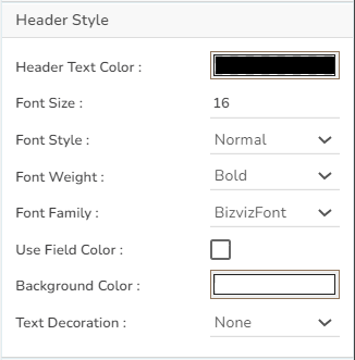 The user can change the Header Text Color, font size-style-weight-family, etc. Either the user can give a background color or we can go for Use Field Colour option and set those colors in the dataset section.