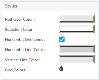 The user can change Roll Over Color, Selection Color, etc. If Horizontal Gridlines between the rows are needed, we can enable them and give color. Also, Vertical grid line color can also be changed. Under the Grid Color, we can change the row color and alternate row color.