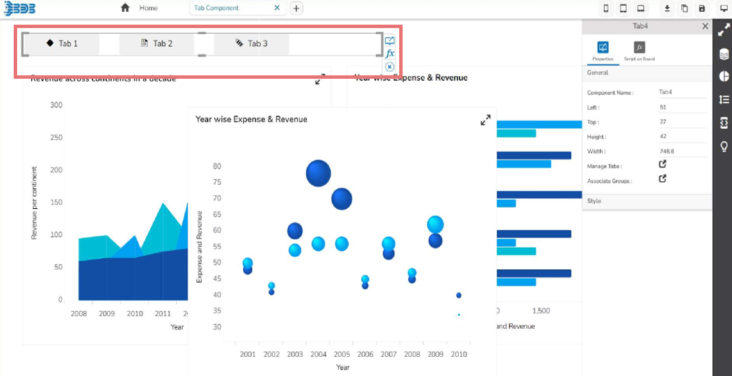 User can change the height, width, top, left. If initial visibility is unchecked, then the chart won’t be visible at the first preview. User can mange the tab & associate the group. The Tab Alignment properties field has been provided to set Vertical or Horizontal alignment for a Tab component.