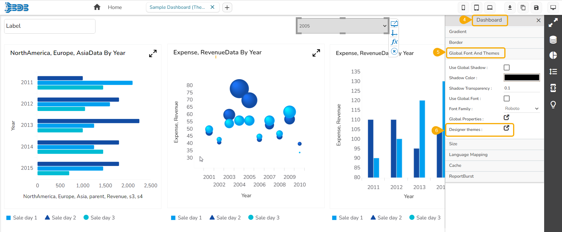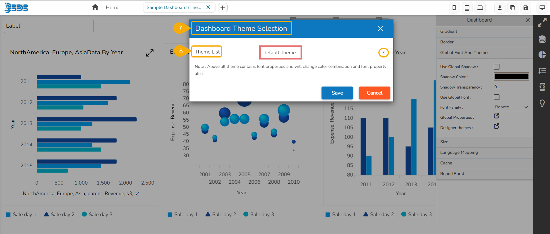 The Designer module provides visually captivating and appealing themes under the ***Dashboard Properties***, so that the users can effortlessly  and instantly transform their dashboard’s appearance. The user can seamlessly switch between different themes with an intuitive drop-down menu.