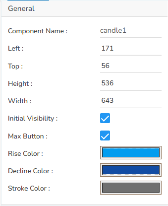 User can change the height, width, top, left. If initial visibility is unchecked, then the chart won’t be visible at the first preview. If max button is unchecked, then user can’t maximize the chart separately. User can also provide the rise color, decline color and stroke color.