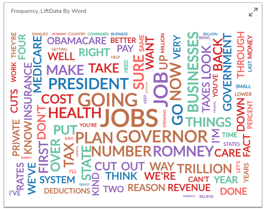 Word Cloud is a visual representation of text data where the font size of a word depicts the frequency of this word in a set of text data. Even though Word clouds are not a perfect tool for data analysis and business data visualizations, they definitely have their place in info graphics. Word clouds can also reveal patterns in your responses that may guide future analysis.