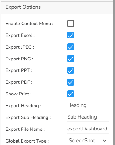 The user can enable the Enable Context Menu to download the reports in different formats if we click on the chart from the preview section. The heading and sub heading of that downloaded chart and the name of the downloaded file can be change from this section.
