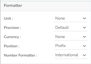 The user can set formatter properties such as Unit, Precision, Currency, Position, and Number Formatter properties for the New Word Cloud chart.