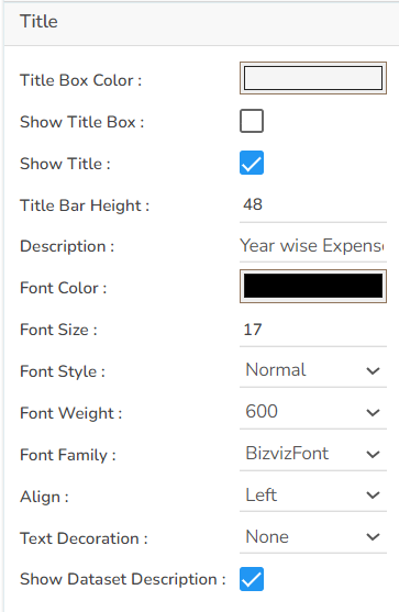 The user can insert or modify the inserted (default) Title text (description), Font color, size, style, etc. The user can also enable or disable the Title box or title text using this properties option. By enabling the Show Dataset Description option the Title will get added from the mapped dataset.