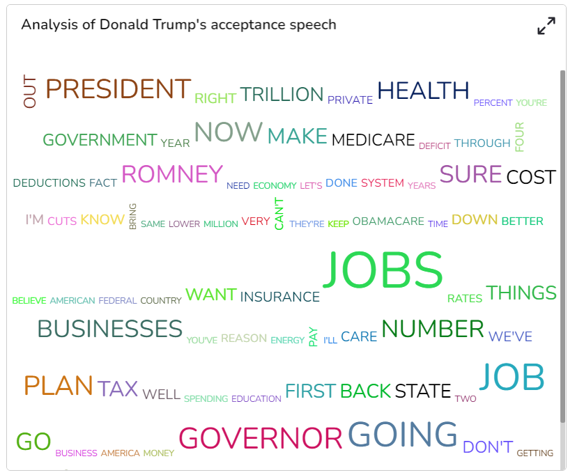 Word Cloud is a visual representation of text data where the font size of a word depicts the frequency of this word in a set of text data. Even though Word clouds are not a perfect tool for data analysis and business data visualizations, they definitely have their place in info graphics. Word clouds can also reveal patterns in your responses that may guide future analysis.