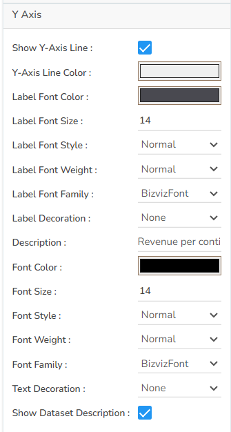 The user can change the axis name, Font color, Font size; enable the axis line, and changed the axis color of the Y Axis.