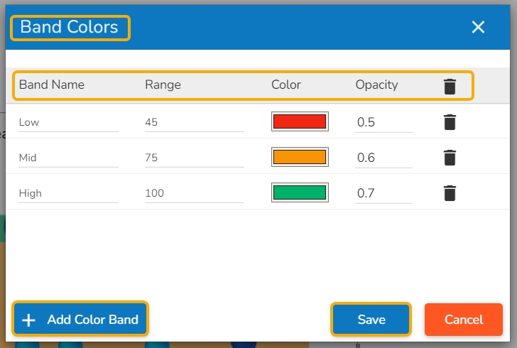 The Alerts properties allows the users to enable the color bands by using the checkbox based on the set Band Properties.