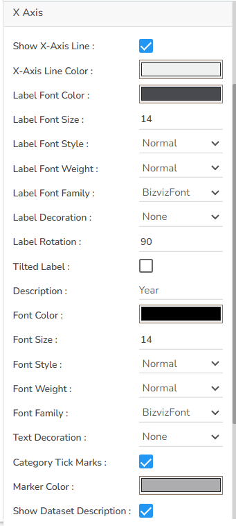 The user can change the axis name, Font color, Font size; enable the axis line, and change the axis color of the X Axis.