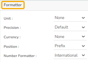 The user can change Y-Axis values in units to %, T, Lacs, M, etc. Precision if we want the value in decimal format. Currency if we want the value in INR, Pound, USD. Position of the currency if it's in prefix and currency in Rupee then the sign will be seen in left-side if it's in suffix then it will be seen in right-side. Number Formatter if we want it in Indian or international.