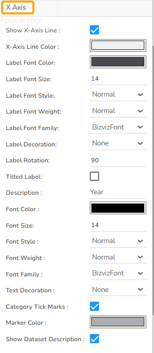 The user can also adda description about the X-Axis and set various Font related properties such as Font Color, Font Size, Font Style, Font Weight, and Font Family for the inserted description.