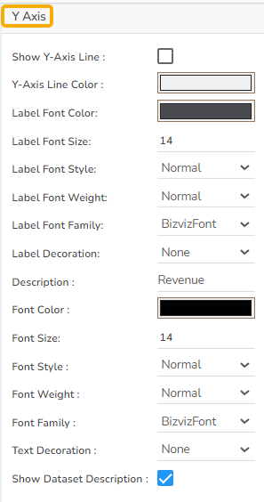 The user can change the axis name, Font color, Font size; enable the axis line, and changed the axis color of the Y Axis.