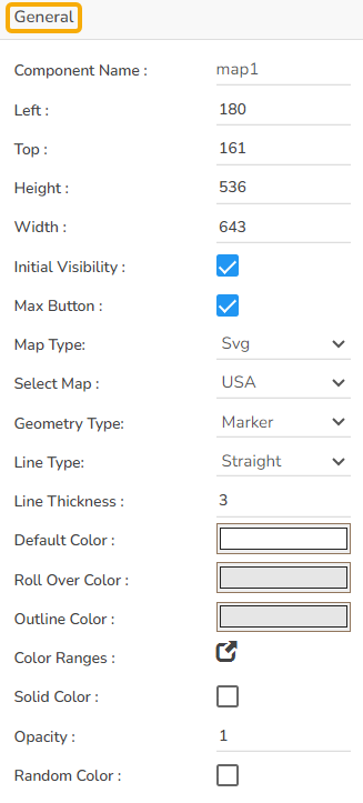 The user can also change the geometry type to marker, change the default color, rollover color, and give the color Range, etc. using the General Properties.