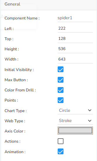 The user can change the height, width, top, left. If initial visibility is unchecked, then the chart won’t be visible at the first preview. If the max button is unchecked, then they can’t maximize the chart separately. Chart type can be changed between Polygon and Circle. Also, web type can be changed between Fill and Stroke.