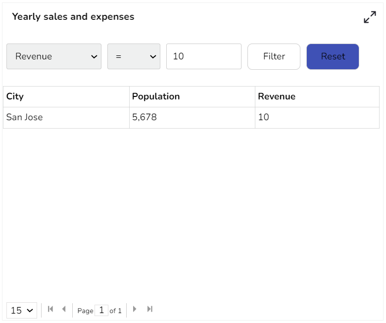 The Paging Data Grid is used to represent data in tabular form. Paging Data Grids can be used to filter data using columns, comparison operators, and search options provided.