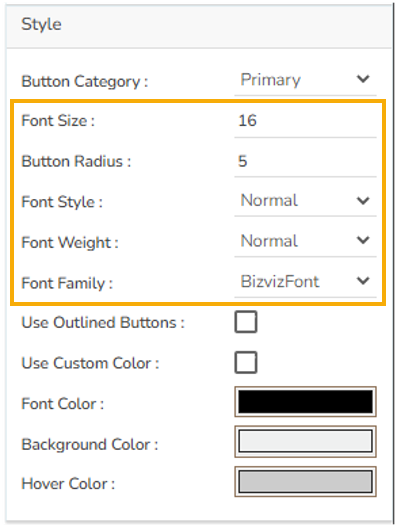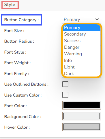 User can set the Button category as primary, secondary etc. & background color and font color as well as font styling properties in this section. Also use can customize the font colour, background color & Hover color.