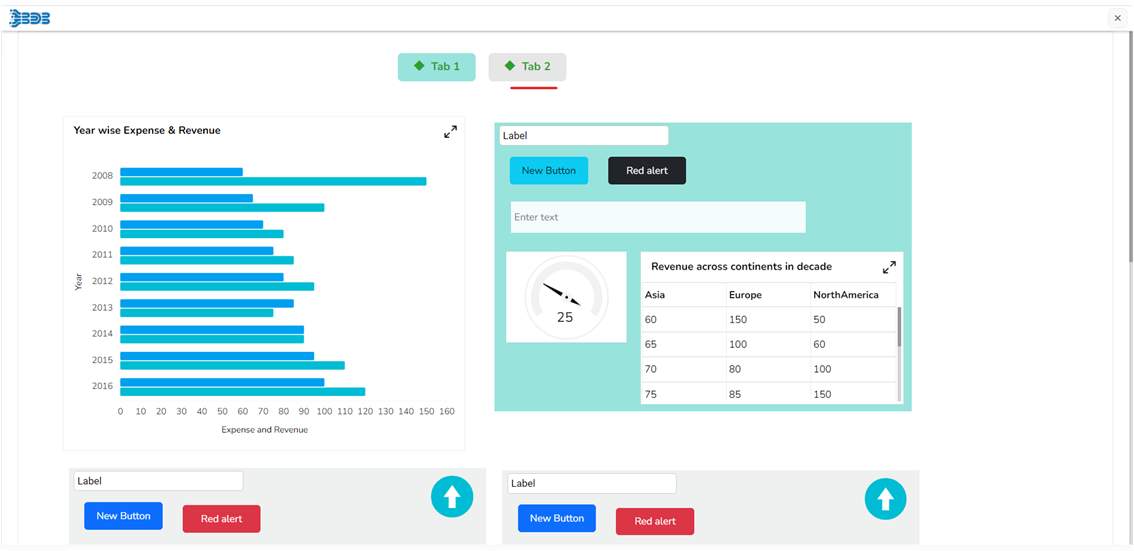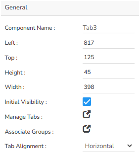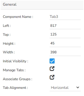 User can change the height, width, top, left. If initial visibility is unchecked, then the chart won’t be visible at the first preview. User can mange the tab & associate the group. The Tab Alignment properties field has been provided to set Vertical or Horizontal alignment for a Tab component.